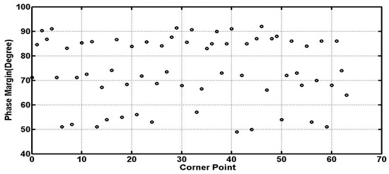 Figure 8 presents the phase margin using different load capacitor values from 1 nF to 12 µF with their corresponding ESR and ESL models with load current ranging from 0 to 200 mA, all across process, voltage, and temperature conveniently called “PVT”. Where VDD is in the range of 2 V to 3 V, fast NMOS and PMOS and slow NMOS and PMOS for process corners, a low temperature of −40 °C and 125 °C for maximum temperature, it shows a worst phase margin of 51 degrees.