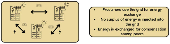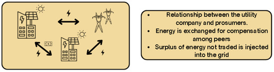 P2P combined with Net-metering: This model (Figure 4) includes an arrangement between prosumers and the electric company and energy trading among prosumers in a community. This path allows prosumers to sell their excess energy generated onsite to other peers in the community. In addition, prosumers will also have the option of selling any surpluses of energy not traded with peers, back to the electricity company. It should be noted that the expenses of using the grid for energy trading in the community are not considered.