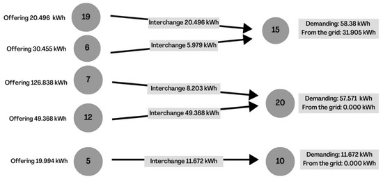 As shown in Figure 5, one prosumer can sell energy to various consumers and one consumer can buy energy from more than one prosumer. These transactions were carried out at noon on a fall day. Note that only the consumers who made an energy exchange with prosumers are considered. Moreover, Figure 5 presents the amount of kWh offered by the prosumers and how many kWh they exchanged with the consumers during one hour of the day. In addition, it displays the amount of energy extracted from the grid. For example, building 15 bought solar energy from buildings 19 and 6 simultaneously. In addition, it consumed a total of 31.905 kWh from the grid during that hour. In the case of prosumers 7 and 12, they both sold their energy to consumer 20. Since its demand was satisfied by the energy exchanged with buildings 7 and 12, it did not need any additional energy from the grid. In the third exchange, prosumer 5 sold 10.505 kWh to consumer 10 and, because this amount did not satisfy his needs, he had to take an additional 1.167 kWh from the grid. Nevertheless, in this case study, it has been noted that, at certain times of the day, the total energy generated is bigger than the total energy consumed, which means this additional energy needs to be injected into the grid. Since their demands were satisfied by the energy exchanged with building 20, they did not need any additional energy from the grid.
