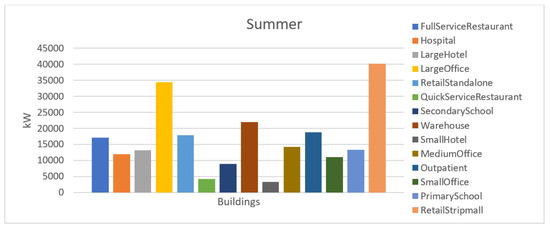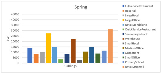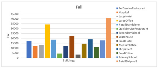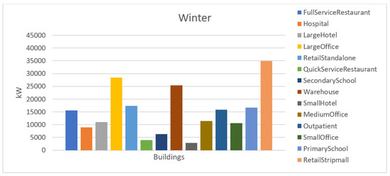 This subsection presents a brief comparison of the total consumption of energy between the different categories of buildings in the four different seasons (Figure 6, Figure 7, Figure 8 and Figure 9). Given that this study has focused on commercial buildings only, it has been decided to divide them into 14 categories. The categories are the following: Full-Service Restaurant, Hospital, Large Hotel, Large Office, Retail Standalone, Quick Service Restaurant, Secondary School, Warehouse, Small Hotel, Medium Office, Outpatient, Small Office, Primary School, and Retail Strip mall. Throughout the four seasons, the highest consumer category is Retail Strip Malls. Mercantile properties, such as Retail Strip Malls and Enclosed Malls, are composed of multiple connected establishments, which significantly increase the use of electricity compared to other types of commercial buildings. Thus, this category will have one of the highest deficits of energy. Following this category is Large Office with the highest consumption of energy, and afterward comes Warehouse. The category with the least consumption of energy is Small Offices. Overall, the season with the highest consumption was Fall (Figure 9) and the season with the least consumption was Winter (Figure 6). Fall’s high energy consumption is likely because during those months the climate is still transitioning from the high temperatures to lower temperatures, and this leads to a more potent cooling system.