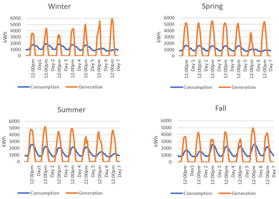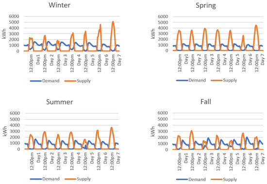 This subsection presents a comparison between the demand and supply of energy for the four different seasons. Each analysis was made for a whole week starting on Monday and ending on Sunday. It is necessary to clarify that the demand was calculated as the difference between the total consumption and generation of energy. According to Figure 11, Fall and Winter had the highest energy demand. Fall’s average peak demand was 1674.9 kWh, while Winter’s average peak demand was 1460.733 kWh. Moreover, this can likely be attributed to the need for more potent heat during this time, hence a higher consumption of energy. When analyzing the demand and supply graphs, the trend indicates that, generally, demand peaks are between the hours of 7 pm and 11 pm throughout the four seasons. On the other hand, demand decreased the most during spring. Usually, the peak in energy generation is between 12 pm and 1 pm. Given the generation and consumption peaks do not coincide, a disequilibrium occurs. In more detail, Spring had the steadiest supply of energy and the highest average peak throughout the week, having an average of 3556 kWh at the peak of each day, which was at midday. On the other hand, the lowest supply was during Fall with a peak average of 1504 kWh.
