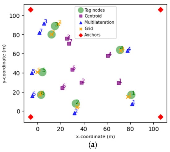 In Figure 5a, the estimated positions (blue, purple, and yellow) have numerical values corresponding to the actual node location (green). The node numbers help to identify the estimated tag node location for an actual tag node location. As per the plot, for more than half the number of tag nodes, multilateration (blue) has a highly accurate estimated location.