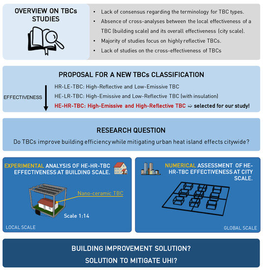 The potential of the third category is interesting for future development and study. In this article, we will explore the performance of a theoretically designed TBC that aims to have both high solar reflectance and high emissivity. To achieve this, we present experimental investigations that highlight the effect of these properties, along with numerical analysis to assess the potential benefits of deploying “HE-HR-TBC” materials at a city scale to improve outdoor thermal comfort and reduce the UHI effect.
