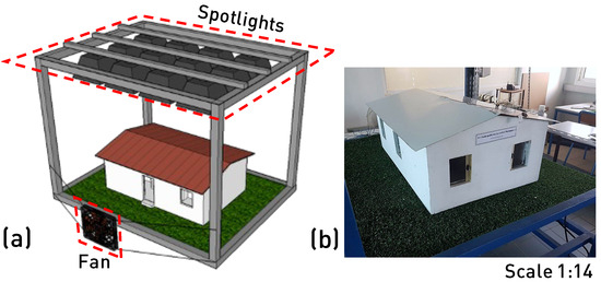 The experimental setup comprises a small-scale support structure with a removable roof. This structure is in an enclosed room equipped with a high-capacity air conditioning system, enabling us to adjust the ambient temperature. The activation of the air conditioning system is dependent on the experimental scenarios. The model’s walls (walls and floor) have a total thickness of 38 mm, composed of 2 faces of plywood (1 with a thickness of 3 mm and the other with 15 mm) and a 20 mm layer of expanded polyurethane.