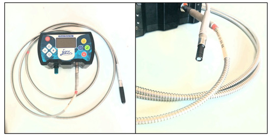 Due to the solar spectrum comprising a more significant proportion of infrared radiation (approximately 50%), most heat absorbed by urban surfaces is attributed to the near-infrared component [57]. This is how we utilized an Ocean Optics® spectrophotometer, model JAZ (see Figure 4), to compare the reflected electromagnetic spectrum profile of a roof covered in classic white paint to that of a roof equipped with a white Thermal Barrier Coating. We also compared the spectrum profile to that emitted directly by the spotlights. These measurements allowed us to understand and evaluate the reflected energy in the visible and near-infrared domains (from 200 to 1100 nm). The measure was conducted in two quasi-synchronous phases once the surface temperatures reached a steady state. Initially, the spectrophotometer cell was positioned orthogonally to one side of the roof at three different points. Subsequently, the cell was placed in the plane of three spotlights. The recording was instantaneous. The data from the various positions were then averaged.