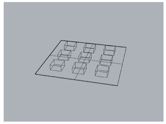 The numerical simulations were conducted within a geometric domain commonly employed in the literature [62,63,64]. The geometric domain described above can be visualized in Figure 5, which illustrates the layout and arrangement of the simplified city typology comprising the surface area of 123 m by 123 m and the nine identical buildings spaced at regular intervals. Each building within the domain measures 18 m by 18 m and has a height of 9 m. The buildings were uniformly spaced along the edges, maintaining a distance of 18 m between them, while the spacing between buildings remained consistent at 18 m throughout the domain. This simplified city typology served as a representative model to investigate the thermal behavior and performance of the studied configurations in a controlled and reproducible manner.
