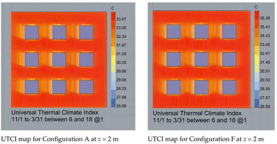 To comprehensively investigate the influence of urban configurations on UHIs, our approach centers on the analysis of outdoor thermal perception utilizing the Universal Thermal Comfort Index (UTCI). The UTCI integrates parameters, such as air temperature, wind speed, humidity, and thermal radiation, to evaluate thermal sensations within an urban environment [58,59,60]. When implementing technical solutions, such as Thermal Barrier Coatings, to mitigate heat absorption by urban surfaces, the UTCI enables measurement of comfort changes before and after, thus assessing the potential attenuation of heat islands and enhancement of conditions for individuals while promoting an environment conducive to building energy efficiency; it is noteworthy that the accurate computation of the UTCI is ensured through the employed numerical simulation software. The Urban Thermal Comfort Index (UTCI), widely used in environmental studies to assess human thermal comfort in urban settings, similarly incorporates meteorological factors as UTCI does, providing a holistic measure of perceived thermal conditions, thus justifying our use of UTCI to examine the impact of Thermal Barrier Coatings on UTCI by the work of Wang et al. [61], given the close relationship between UTCI and ambient temperature.
