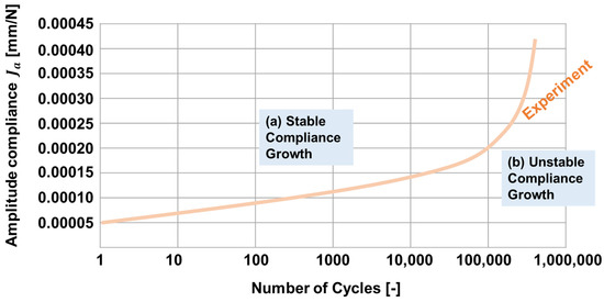 Along with the previously described correlation between compliance, crack propagation and fatigue testing, the following distinct regions can be identified: Figure 1a shows where stable compliance growth can be found, and Figure 1b shows where unstable compliance growth takes place. The region of stable compliance growth can be identified as the region in which the linear relationship between the number of cycles (in log scale) and amplitude compliance can be constructed. The moment this relationship is no longer linear, the region of unstable compliance growth begins. The determination of these two regions will be discussed in more detail in Section 4.