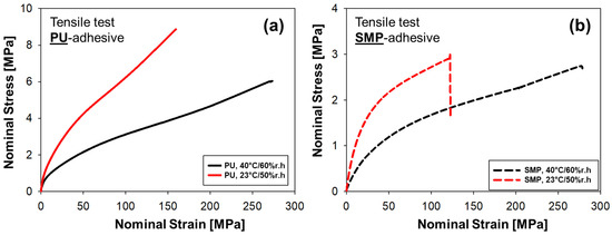 One of the best properties that both adhesives show is reparability [31], a key advantage in terms of safety design. However, while polyurethanes consist of isocyanate-terminated polymers [32] with polyaddition cure, SMPs were developed as an isocyanate-free alternative, consisting of silane-terminated polyether blocked with a cross-linker through poly-condensation [33]. An adhesive characterization of both adhesives was performed through quasi-static tests of pure adhesive specimens according to DIN 6701-3 [34] at 23 °C/50% r.h. and 40 °C/60% r.h. Both adhesives exhibit strong non-linearity (hyperelasticity) that is typical of elastomeric materials, as one can observe in Figure 2.