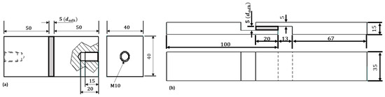For the adhesive joints, the substrates were made of the aluminium alloy EN AW 6082 (AlMgSi). An epoxy primer coating for metals was applied on the substrates to improve adhesion. For both adhesive systems, prior to bonding, the substrates were cleaned with solvent, and then, a liquid primer was applied. Since both adhesives were moisture-curing systems, the diffusion of moisture from the ambient air into the bonded joint played an important role. Each adhesive system had different curing times (two weeks for the PU and four weeks for the SMP). For each type of adhesive joint geometry, a corresponding bonding device was used to ensure the correct geometry parameters (e.g., adhesive layer thickness, overlap length) until the adhesive joints were fully cured [14]. The dimensions of the joint are given in Figure 3 with both joints having a thick nominal adhesive layer of = 5 mm.