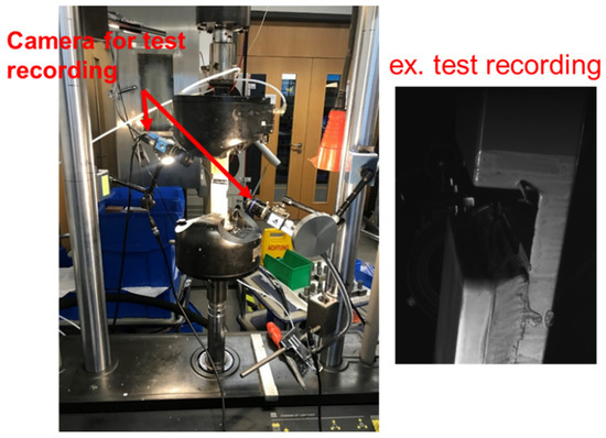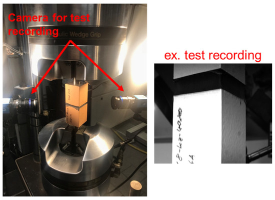 Throughout each test cycle, the force and displacement values (maximum and minimum) were recorded, allowing for the calculation of the stiffness and compliance per cycle. To visually monitor the tests, two cameras were positioned on each side of the adhesive joint, as shown in Figure 4 (butt joint) and Figure 5 (TAST joint).