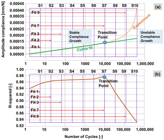 The proposed method relies on a recursive fitting procedure in Python, an extension of a method proposed by Çavdar et al. [16], to determine the transition point that separates the region of stable compliance growth from the region of unstable compliance growth. As shown in Figure 6a, the lifetime is iteratively divided into sub-rectangles of equal width (S1, S2…). Then, linear fitting procedures (Fit 1, Fit 2, …, Fit n) with increasing width (green curve) are carried out to fit the experimental data (orange curve) until the limit of the sub-rectangle using Equation (7):