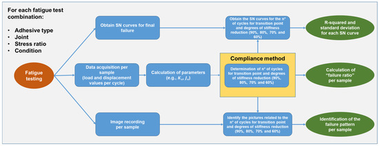 Figure 7 shows a flowchart that illustrates the study design. For each unique combination of fatigue tests, which includes adhesive type, joint type, stress rate and environmental condition, three distinct sets of data will be collected: (i) SN curves specific to the given test combination; (ii) load and displacement values recorded for each sample subjected to testing within that combination; and (iii) image recordings taken at regular intervals throughout the testing cycles for each sample within that combination. Once the parameters, such as stiffness and amplitude compliance, have been computed, it is possible to determine the number of cycles associated with each degree of stiffness reduction. By using the compliance method, the number of cycles linked to the transition point can also be determined.