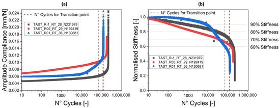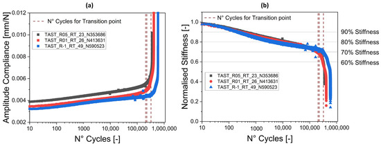In Figure 8a, vertical reference lines have been implemented to illustrate the point at which the transition from stable compliance growth to unstable compliance growth (known as the transition point) occurs as the number of cycles increases. This was performed using the method described in Section 4. In Figure 8b, the normalised stiffness was plotted against the number of cycles. Horizontal reference lines were used to indicate the points at which each degree of stiffness reduction (90%, 80%, 70% and 60%) was reached. The vertical reference lines, related to the transition point, were used later in Figure 8b to facilitate the comparison between the stiffness reduction degree approaches and the transition point.