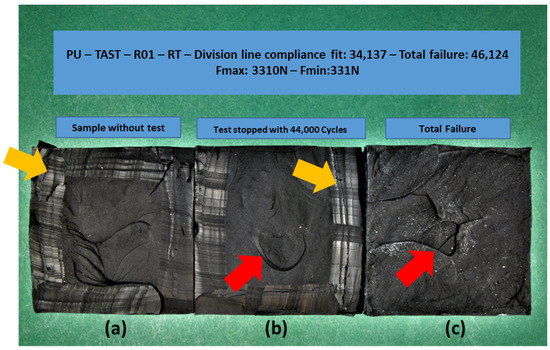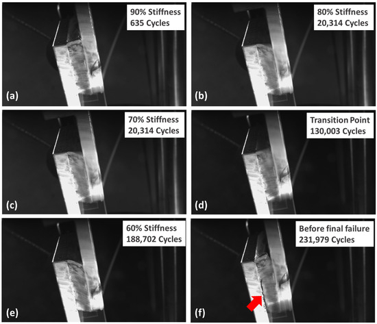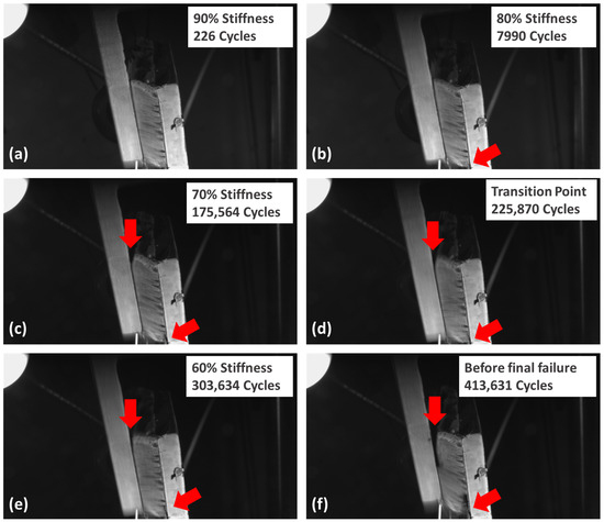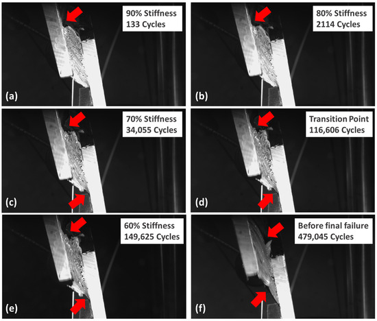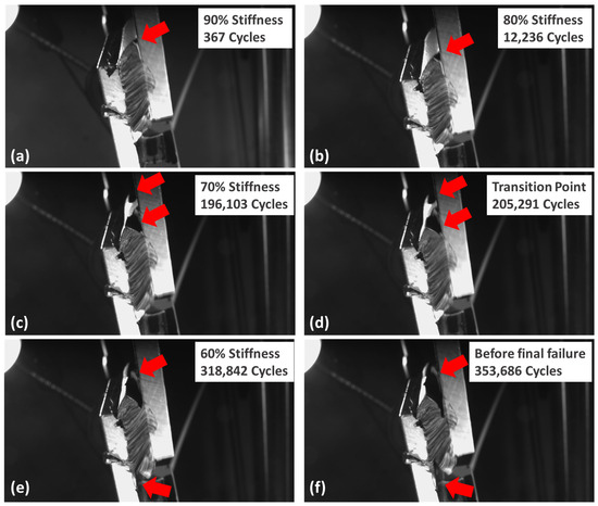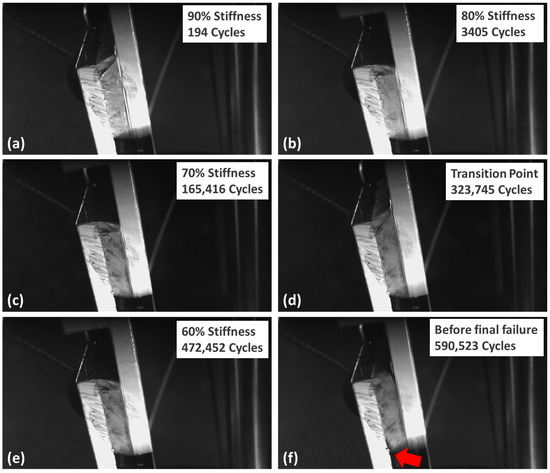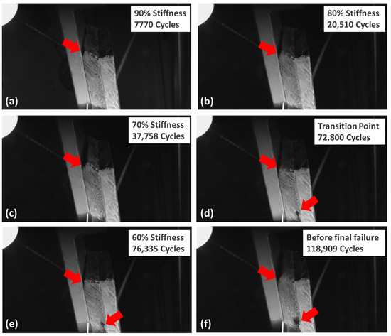 In Figure 9a–f, Figure 10a–f and Figure 11a–f, test images depict the number of cycles associated with 90%, 80% and 70% of initial stiffness, the division line from compliance fit (N° cycles for transition point), 60% of initial stiffness and before final failure for the R = 0.1/0.5/−1 tests, respectively. Red arrows highlight the cracks that are occurring in the samples during testing.