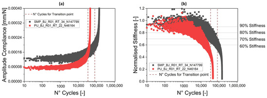 Butt joint, R = 0.1, RT (in black: SMP adhesive; and in red: PU adhesive): (a) N° cycles × amplitude compliance; (b) N° cycles × normalised stiffness.