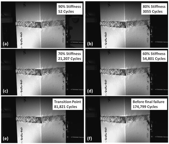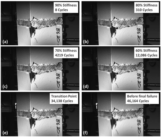 In Figure 13, Figure 14 and Figure 15a–f, the test images show the number of cycles associated with 90%, 80% and 70% of initial stiffness, the compliance split line fits, 60% of initial stiffness and before final failure for the R = 0.1/0.5/−1 tests, respectively.