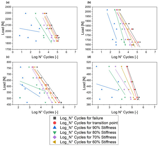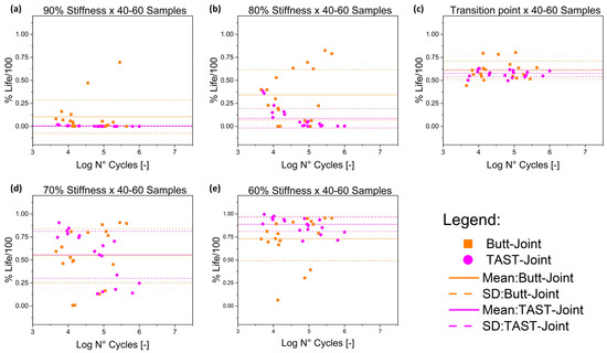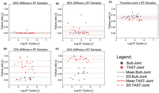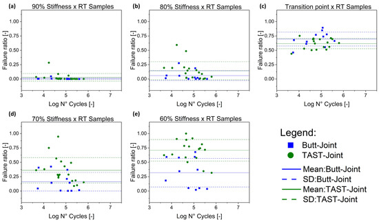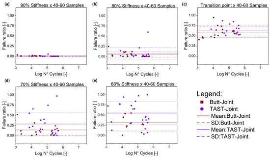 To overcome the described challenges, the concept of “failure ratio” was introduced in Section 5.1. The idea is to obtain a method that can be applied to both TAST and butt joints regardless of the stress ratio, conditions, or the range of the number of cycles to final failure. For this purpose, the fatigue data of the TAST and butt joints for the stress ratios of R = 0.1/0.5/−1 (fatigue loading under constant amplitude) were combined in terms of adhesive type and environmental conditions (23 °C/50% r.h. and 40 °C/60% r.h.). Then, for each test performed, the number of cycles to reach the different degrees of stiffness (90%, 80%, 70% and 60% of the initial stiffness value) and to reach the transition point were identified according to Section 4.