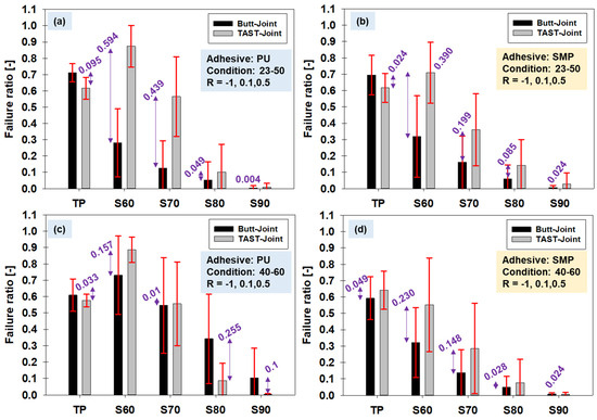 Average failure ratio combining fatigue data for stress ratios of R = −1, 0.1 and 0.5 for different approaches: (a) PU adhesive at 23 °C/50% r.h., (b) SMP adhesive at 23 °C/50% r.h., (c) PU adhesive at 40 °C/60% r.h., and (d) SMP adhesive at 40 °C/60% r.h. with TP (Transition Point), S60 (60% stiffness), S70 (70% stiffness), and S80 (80% stiffness).