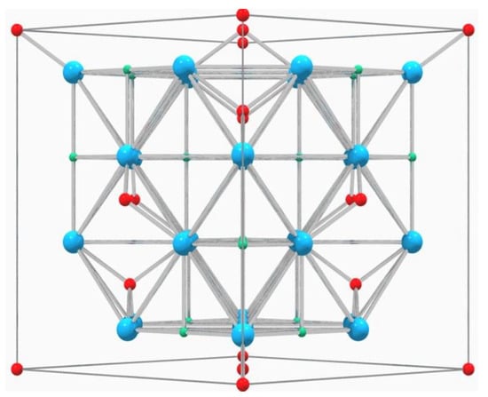 Structure of spinel (from 011 plane) where blue atoms correspond to oxygen, red atoms to divalent cations, occupying tetrahedral positions, and green atoms to trivalent cations, occupying octahedral positions [13].