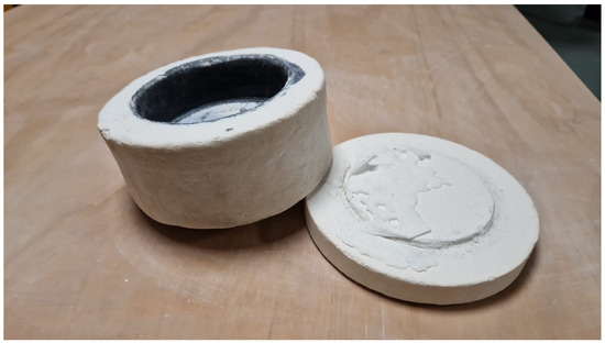 Microwave-assisted thermal treatment was conducted employing a household microwave oven rated at 800 W to heat an Al2O3 container internally coated with SiC (refer to Figure 2) [10]. Various samples were positioned within this container, and microwave radiation at 800 W was employed for durations of 20 and 40 min, resulting in peak temperatures of 900 °C and 970 °C, respectively. Temperature measurements were determined using FERRO’s process temperature control rings (PTCR) of the ETH type, designed for a temperature range of 850 °C to 1100 °C.