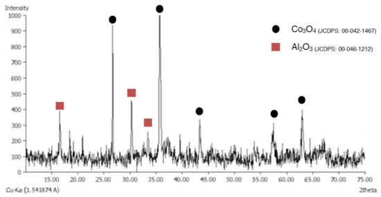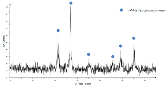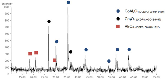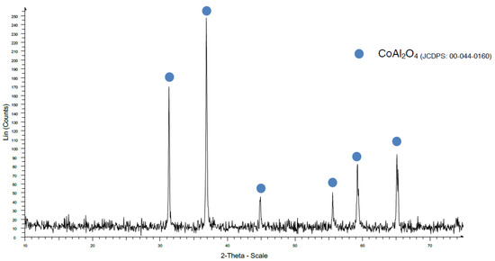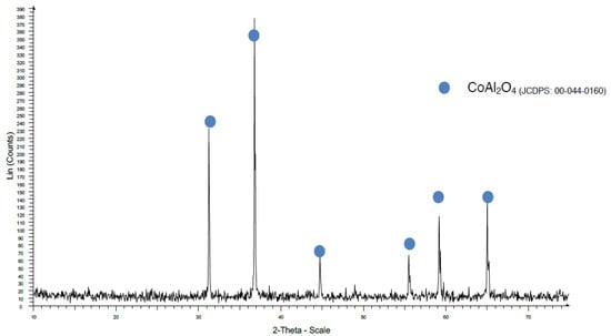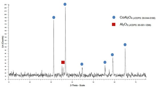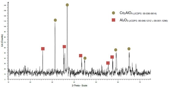 When a temperature of 970 °C was used, some Al2O3 was detected with the traditional method (Figure 10), but when the coprecipitation method was used, the CoAl2O4 crystallization was very good (Figure 11).
