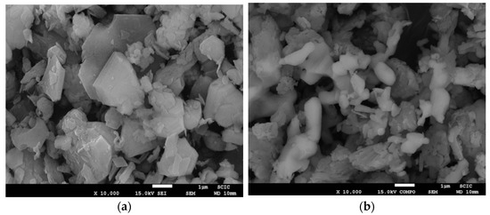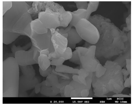 Figure 12 shows SEM images of samples produced by traditional firing, (a) prepared by the traditional method, and (b) by coprecipitation. In both cases, an irregular size distribution was obtained, but in the coprecipitation case, it can be observed that the crystal size is smaller than that produced in the traditional way.
