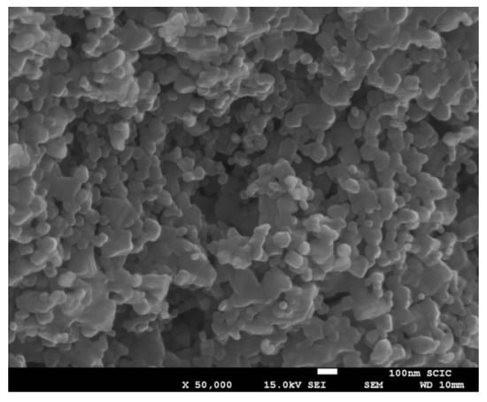 The high-speed firing and low dwelling times in the microwave process and the homogeneity of the temperatures reached inside the crucibles prevented crystalline growth, and in all cases, a distribution of nanometric-sized particles close to 100 nm was obtained (Figure 15). Although the material is agglomerated, there was no sintering between the particles.