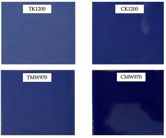 Figure 16 shows the final aspect of glazed tiles prepared with different pigment samples. The most intense colors were obtained by the coprecipitation method in both traditional and microwave firing. It can also be observed that, regardless of the preparation method, microwave calcination also improves the intensity of the color obtained.