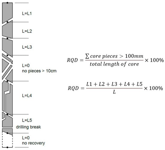 In the exploration stage of tunnels that are built within rock, the ground condition is commonly obtained by drilling boreholes. RQD, developed by Deere et al. [], provides a quantitative evaluation of rock integrity from a borehole. It is defined as the ratio between intact core pieces longer than 100 mm and the total length of the core. The description of RQD is shown in Figure 1.