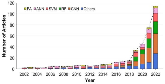 The development of machine learning (ML) has provided a new way for rock mass classification. Instead of relying on human judgement and qualitative observations, which can be influenced by subjective biases and lead to inconsistent results, ML can analyse large amounts of data to identify rock mass characteristics automatically. This not only enhances the accuracy of classifications but also offers a scaleable and consistent approach. With the increasing availability of data from geological surveys, sensors and imaging tools, ML models can be trained to recognize intricate patterns and nuances that might be overlooked. The utilization of ML for discerning underground materials has been used in the mineral exploration field. By employing advanced algorithms, vast geological datasets can be analysed and potential mineral-rich zones can be predicted effectively. Another promising application of ML in the field of geotechnical engineering and mining is its potential to predict hazards, for example, rockburst. Rockburst is a violent discharge of built-up stress within a rock mass, posing significant safety risks in mining and tunnelling operations [,,,]. Traditional anticipation of rockburst depends on in situ observation and analysis of diverse geophysical and geotechnical indicators. However, the complex nature of the factors that lead to rockburst makes the prediction challenging. By analysing the data from sensors monitoring seismic activities, rock deformations and other pertinent parameters, ML can detect subtle patterns that might indicate rockburst with high accuracy [,]. Some researchers also use ML to evaluate rock components as well as rock mechanics parameters, such as permeability, shear strength and the elastic modulus of rock. The results obtained from ML are consistent with those of laboratory tests [].