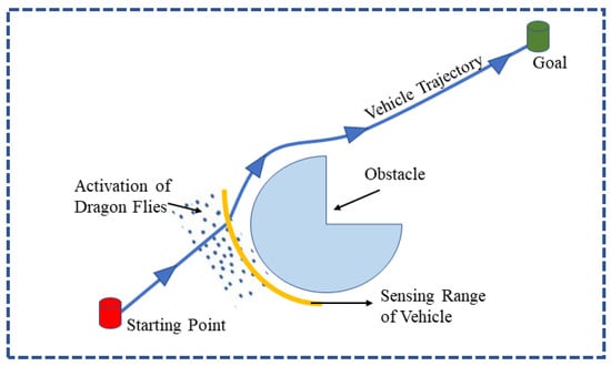The main objective of using the dragonfly algorithm (DA) is to navigate an autonomous vehicle in an unstructured environment consisting of different obstacles. This objective is transformed into a minimization problem with two functions. The first is to avoid obstacles, and the second is to find the shortest possible path. Figure 1 depicts the environment of the autonomous vehicle’s target and goal positions.