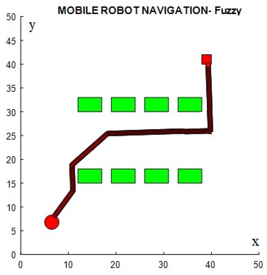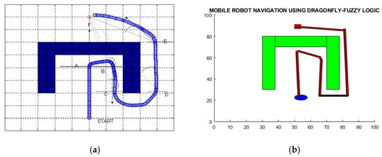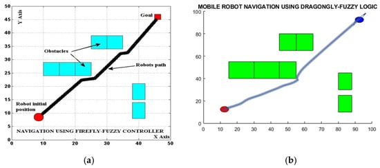 The performance evaluation of the proposed dragonfly–fuzzy controller was meticulously conducted through simulation analysis, enhancing the clarity and transparency in the comparison with two existing controllers under two distinct environmental setups. Figure 13a showcases Joshi and Zaveri’s [43] neuro–fuzzy controller, whereas Figure 14a depicts Patle et al.’s [44] firefly–fuzzy algorithm leveraged for mobile robot navigation in a simulated environment. Correspondingly, Figure 13b and Figure 14b demonstrate that consistent environmental conditions were maintained and detail the number, dimensions, and positions of the obstacles, as well as the initial and final positions of the unmanned vehicle. These enhancements aim to provide comprehensive insight into the scenarios tested.