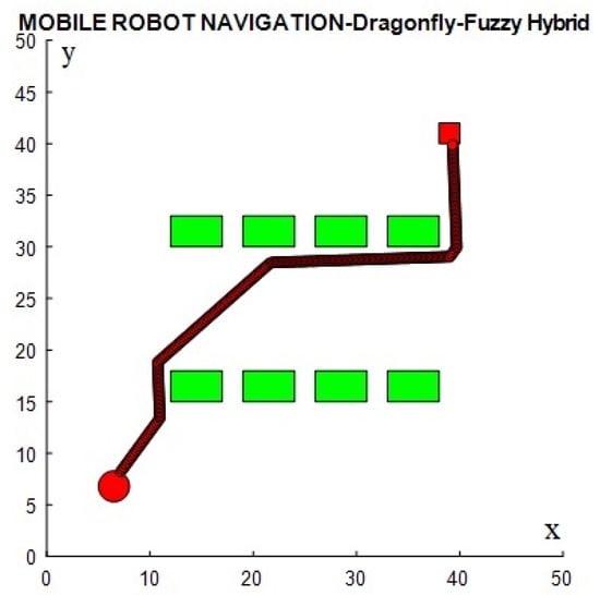 In a comparative study conducted by Xiang et al. [45], the effectiveness of the dragonfly–fuzzy algorithm for mobile robot navigation was assessed against traditional A* and A*–greedy algorithms, as illustrated through the simulation depicted in Figure 15. The results of the comparison detailed in Table 8 reveal notable advantages of the dragonfly–fuzzy algorithm over the conventional A* algorithm. Specifically, it was observed that the dragonfly–fuzzy algorithm achieved a 3.6% reduction in path length compared to the traditional A* algorithm. Additionally, the computational time was significantly reduced, showcasing an 11% improvement. When compared to the A*–greedy algorithm, the dragonfly–fuzzy algorithm demonstrated a similar path length with only minor variations, yet it exhibited significant savings in computational time. These findings underscore the efficiency and effectiveness of the dragonfly fuzzy algorithm in mobile robot navigation, making it a promising alternative for optimizing path planning and reducing computational overhead when compared to traditional A* and A*–greedy approaches.