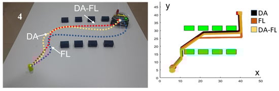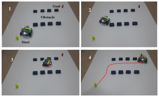 All three controllers (DA, FL, DA–FL) were experimentally run in a similar environment to validate the simulation results, as shown in Figure 11, where the movement is shown in four phases from 1–4 and the red dotted line is the path followed by the mobile robot. These experimental results are presented for the path length and navigation time, as shown in Table 5.