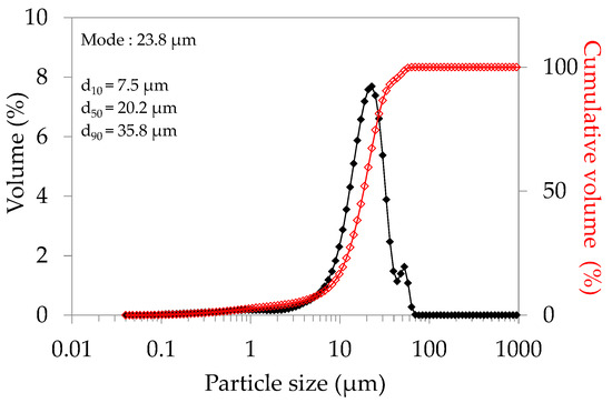 An ordinary Portland cement CEM I 52.5R provided by Lafarge Holcim (Teil, France) was used. Its particle size distribution was determined using a laser granulometer (LS 13320 Beckman Coulter, Villepinte, France) (Figure 2). The Blaine fineness of this cement is 0.44 m2/g.