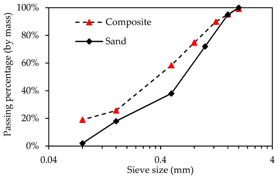 CEN standard sand [38] was chosen. The particle size distributions of the sand and composites were determined according to the NF EN 933-1 standard [39] through vibratory sieving using sieves of 2 mm, 1.6 mm, 1 mm, 0.5 mm, 0.16 mm, and 0.08 mm. Composites particles larger than 2 mm were removed. The particle size distributions are shown in Figure 3. It can be noted that the composites contain more fines particles than standard sand.