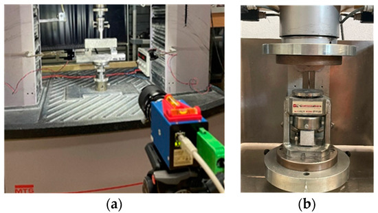 The mechanical tests were carried out in accordance with the NF EN 196-1 standard at 28 days [38]. For each mortar composition, a three-point bending test was performed on three specimens (40 × 40 × 160 mm3) using an MTS machine-100kN (MTS Systems, Créteil, France) equipped with a camera for image acquisition under a displacement rate of 0.5 mm/min (Figure 4a). Fifteen samples were tested using the 3-point bending test.