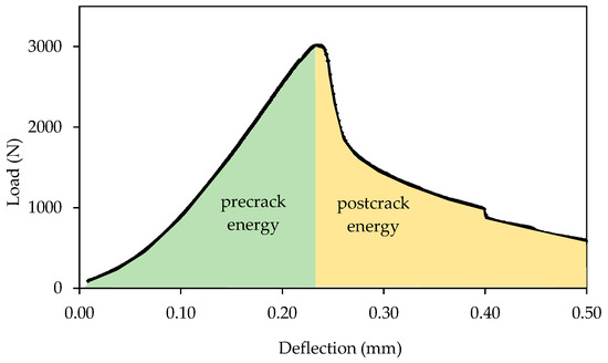 The flexural toughness can be described by the energy under the load-deflection curve up to the final deflection. It is worth pointing out that the final (or design) deflection should be unchangeable for mortar mix once it is specified, while the first crack peak can vary from sample to sample [44]. In this study, the flexural toughness was assessed by calculating the total energy (precrack and postcrack energies) under the load-deflection curve (Figure 5).
