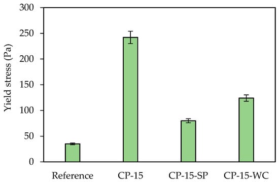 It is often reported in the literature that the incorporation of composites leads to a significant loss of workability, which can be avoided either by increasing the water content (water to cement ratio) or by incorporating a superplasticizer. In fact, due to flocculation, composites (especially fine fraction <80 µm) can “absorb” or trap part of the mixing water leading to workability loss. In order to assess the workability loss due to the incorporation of composites, yield stress measurements were performed on cement pastes using a rotational rheometer AR 2000EX (TA Instruments, New Castle, DE, USA) equipped with four-blade vane geometry. The yield stresses were measured with the stress growth procedure [40,41,42] in triplicate. The effect of the superplasticizer and water to cement ratio was examined in cement paste with the 15% replacement of cement with the fine fraction of composite (Table 2). Cement pastes were mixed with deionized water at ambient temperature (20 ± 2 °C) in a planetary agitator according to the following sequence: 5 min mixing at 500 rpm, scraping the mixer walls to homogenize the mix (30 s), and 2 min mixing at 1000 rpm. A polycarboxylate-based superplasticizer with a dry extract of 20% was added after 5 min of mixing (delayed addition).