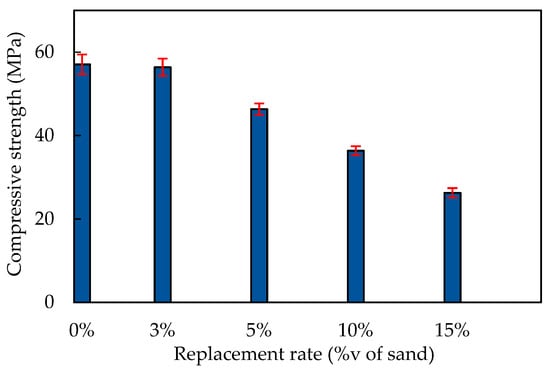 Figure 7 presents the effect of the partial replacement of sand with the composite on the compressive strength. For the control sample without GFRP, the compressive strength was 57 MPa. The substitution of 3% of sand with GFRP slightly affected the compressive strength. Beyond this rate, a significant drop in the compressive strength was observed. It is worth noting that the loss of the compressive strength cannot be only due to the sand replacement but also to the increase in the water content (equivalent w/c).