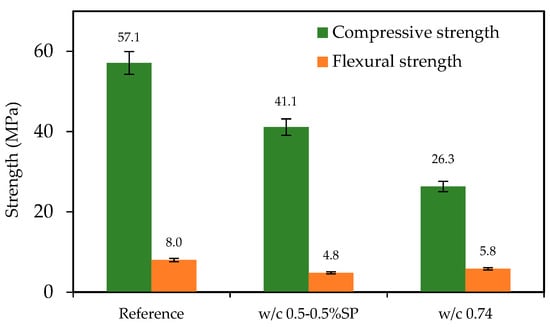 Flexural and compressive tests were performed after 28 days. The results are summarized in Table A1 and Table A2 (Appendix A).