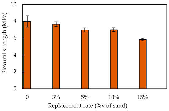 Furthermore, the flexural strength as a function of the replacement rate is shown in Figure 9. It can be noted that the partial substitution of sand with GFRP was accompanied by a reduction in the flexural strength. The reference sample displayed a flexural strength of about 8 MPa, while the cement mortar with 15% composite exhibited a flexural strength of 5.8 MPa.