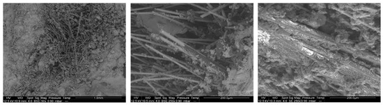 It can be noted that the mortars incorporating GFRP display a higher toughness than the reference mortar. In fact, the rupture of the reference mortar without GFRP is very brittle as soon as the first crack appears. This reference mortar displays a flexural toughness of 0.351 N.m, while the mortar incorporating 15% GFRP has a relatively higher toughness (0.642 N·m), despite the reduction in the flexural strength, indicating a reduction in the brittleness after the initiation of the first crack. Therefore, it seems that the fibers contained in the GFRP help slow down the propagation of cracking. However, it has to be kept in mind that the improvement in the brittleness depends on the degradation of the fibers in the strongly alkaline environment of the cement paste (alkaline hydrolysis) [46,47]. The microstructure of the fractured surface of the cement mortars after the bending test showed the presence of glass fibers in the cement matrix after 28 days (Figure 10). However, it will be necessary to verify the non-degradation of these fibers over longer periods of time.