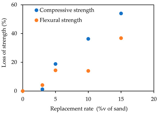 Loss of the compressive and flexural strength as a function of the replacement rate.