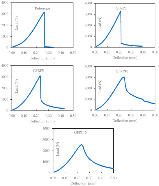 Load–deflection curve obtained with a 3-point bending test for different proportions of GFRP within mortars.