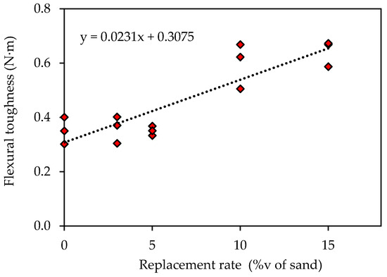 In order to evaluate the attenuation in the brittleness of mortars containing GFRP, a flexural toughness corresponding to the total energy under the loading curve was determined [44]. Figure 13 presents the variation in the flexural toughness as a function of the replacement rate, and Table A3 summarizes the obtained results.