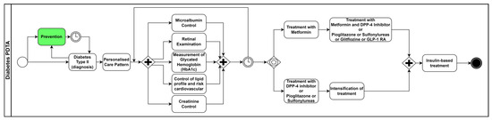 The BPMN workflow of Figure 5 is the result of the validated design, describing the platform monitoring patients during the prevention phase. The workflow examines the combined risk of patients to be affected by diabetes or to be injured by a stroke, thus defining a PDTA of prevention. The same workflow is also suitable for the prevention of the hypertension risk by adopting specific sensors, mainly measuring heart disease. The diagram in Figure 5 is structured into three pools, indicating the processes of the three main actors involved in the system: