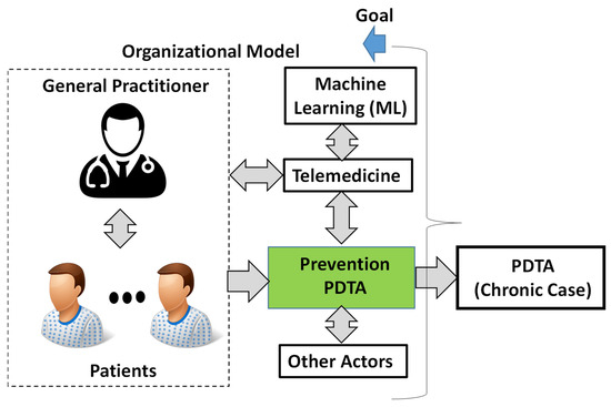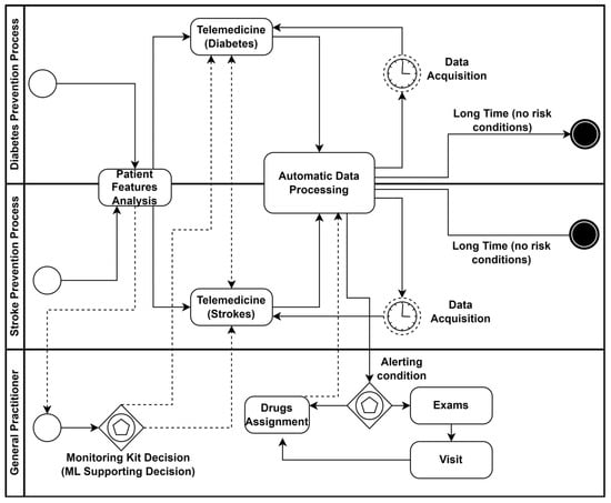 Process mining (PM) is an important approach suitable for designing processes based on machine learning (ML) decision-making engines. PM has been applied to improve industrial processes [1,2] and subsequently to design healthcare processes [3,4] regarding the cost optimization of healthcare services [5], telemedicine [6], and patient fall risk management [7]. The application of PM is important for the design of organizational models based on workflows integrating ML algorithms and supporting decisions about human resource (HR) allocation or engagement [6]. The ML-HR decision-making engine upgrades the PM model to a Process Mining Organization (PMO) model. A method suitable for representing and sketching processes is the Business Process Modeling and Notation (BPMN) approach [8]. BPMN is an international standard [9,10], providing graphical elements to map processes. The BPMN is useful to design healthcare processes such as Diagnostic and Therapeutic Care Pathways (PDTAs). An example of a PDTA mapped by BPMN is illustrated in Figure 1, representing the ‘AS IS’ care path of diabetics [11]. As observed in Figure 1, the Italian diabetic PDTA is exhaustive for the chronic pathology, but no details are provided for primary prevention highlighted by the green box (prevention task). The goal of the proposed paper is therefore precisely the optimization of the prevention task using telemedicine and ML facilities. Specifically, we have proposed a basic organizational model and technological facilities that can be used to implement a prevention PDTA with the goal of eliminating the risk of chronic degeneration, and, consequently, avoiding the execution of the whole PDTA process of chronic care, which requires high resource costs. Figure 2 presents the sketch of a diagram summarizing the goal of the paper.