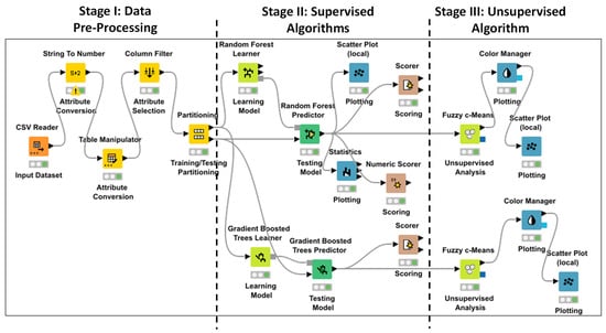 KNIME workflow implementing ML supervised and unsupervised algorithms, following from left to right the three stages of data processing (Stage I, Stage II, Stage III).